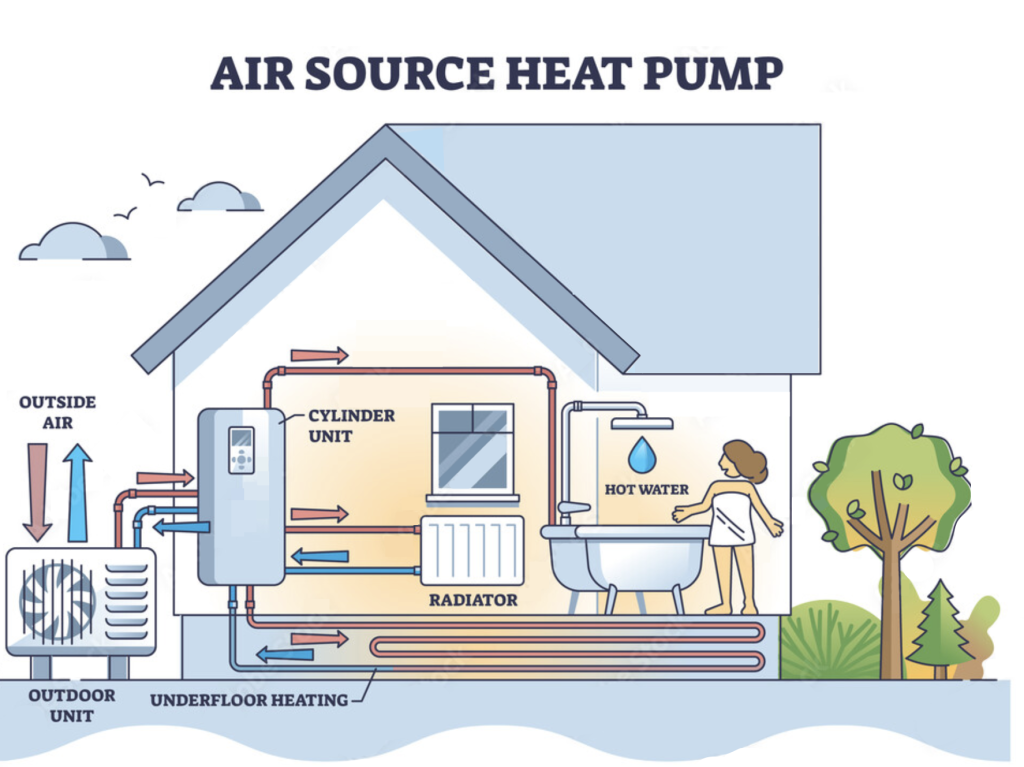 Vazdušna toplotna pumpa koristi energiju spoljašnjeg vazduha za grejanje prostora i vode. Toplota se prenosi u unutrašnji sistem, gde se distribuira kroz podno grejanje ili radijatore – bez sagorevanja i štetnih emisija.